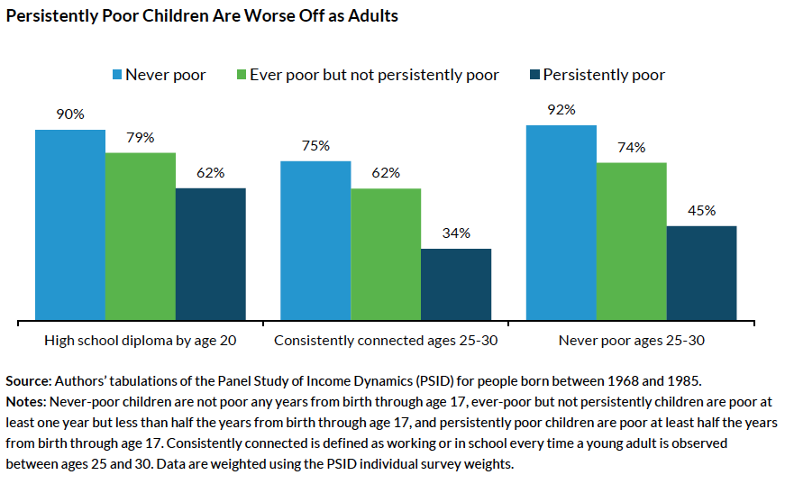Persistently poor children are significantly less likely to succeed economically as adults than their nonpoor and less-poor counterparts. Only 62 percent of persistently poor children complete high school compared with 90 percent of children who never experience poverty. Further, only a third (34 percent) of people who were persistently poor as children are consistently working or in school between the ages of 25 and 30, and less than half (45 percent) are never poor between the ages of 25 and 30.