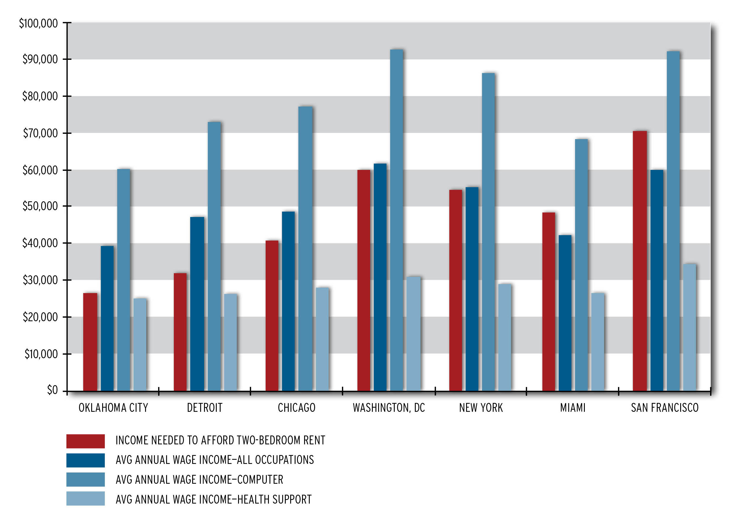 One region that looks good on these metrics is Oklahoma City. Somehow, it avoided the excesses of the boom years, and its economy has weathered the downturn better than most. Housing costs are low, and though wages are too, a personal service worker can almost afford the rent for a two-bedroom apartment. And at 5 percent, Oklahoma City’s unemployment rate is among the lowest in the country.