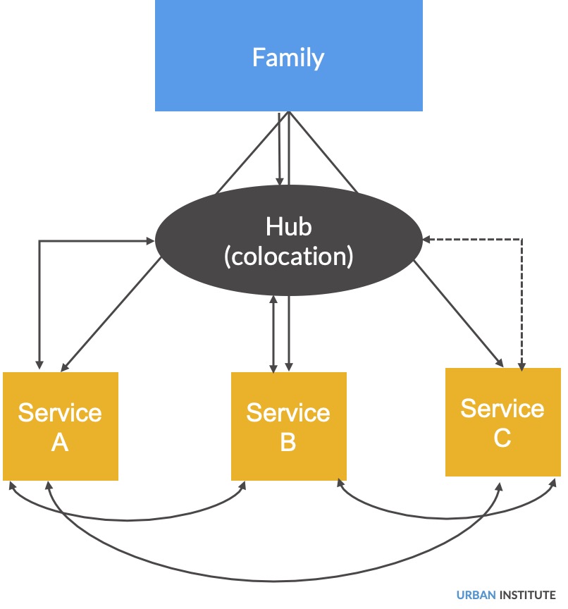 Ideally, Massachusetts families could access connections to services either through a “hub” with co-located services, or by being referred to services through existing providers, called a “no wrong door” approach. The figure below shows an ideal system that includes both a hub and a no-wrong-door approach.