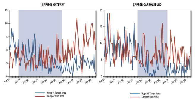 As the graphs show, crime fell during the reconstruction and stayed low afterward—not the case in comparable housing units. HOPE VI appears to have reduced crime by as much as 60%, and, as crime fell in the targeted units, it dropped in the surrounding neighborhoods too.