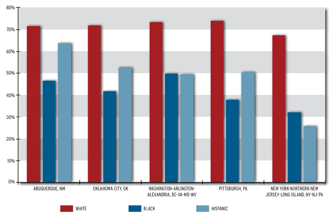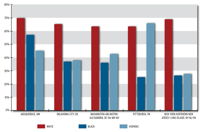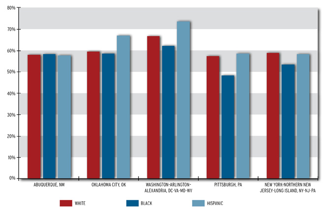 How about job opportunities? In the Washington, DC, region 67 percent of working-age whites are employed, compared with only 62 percent of blacks, but 74 percent of Latinos. The black-white employment gap is narrower in both Albuquerque and Oklahoma City. And again, Pittsburgh seems to perform well for Latinos but poorly for African Americans.