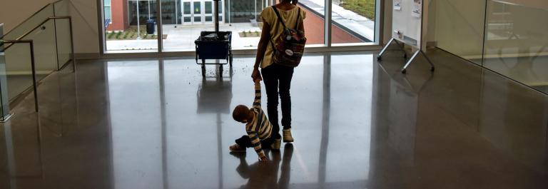 <p>On the second day of a weeklong job training program, Angelica Dunn makes a call with her son, Thomas-Johnathan Czarnikow-Dunn, after being asked to leave class during a quiet test-taking time at Metropolitan Community College - Fort Omaha Campus in North Omaha on Tuesday, May 1, 2018, in Omaha, NE. Angelica had set her alarm clock for 6pm rather than 6am and didn't have time to secure day care for the child. Photo by Jahi Chikwendiu/The Washington Post via Getty Images.</p>