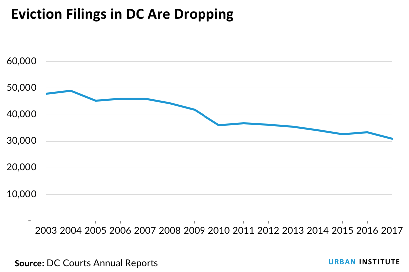 Despite high rents in the District of Columbia, annual reports from the DC courts show a downward trend in eviction filings. The number of evictions filed by landlords fell from 48,000 in 2003 to just over 31,000 in 2017. During a period in which DC added renter households, why would eviction filings go down?