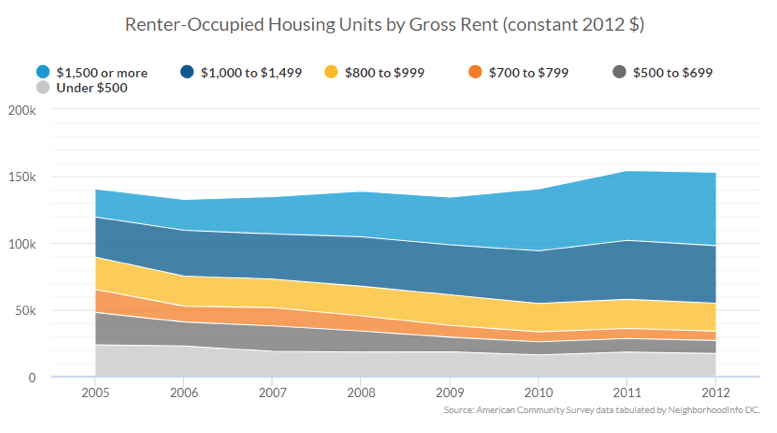 According to local legal experts, a drop in eviction filings could be a trailing indicator of DC’s changing rental market. Urban Institute analysis found that, between 2005 and 2012, DC lost around 31,000 low-cost rentals (i.e., those with rents less than $800 per month in 2012 dollars), cutting the supply of low-rent units nearly in half. Meanwhile, the District added to its supply of rentals charging $1,500 or more per month.