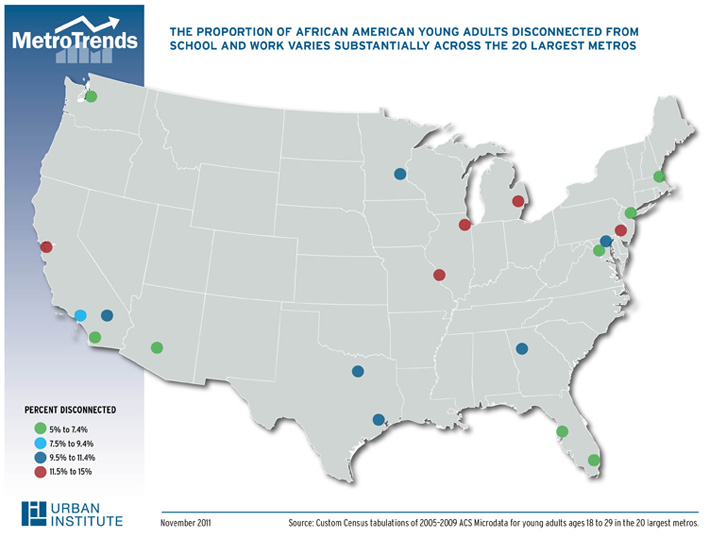 The latest downturn may be no exception. American Community Survey data show that African Americans ages 18-29 are the least connected of all youth. In fact, their disconnection rates can reach as high as near 15% in such Midwestern cities as Chicago and Detroit.
