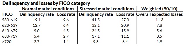 Based on the current mix of business, the FHA can expect to suffer losses of 3.8 percent during normal periods, while the loss during stressed periods is 13.8 percent. Assuming a 90 percent probability of the normal scenario and 10 percent probability of the stressed scenario suggests expected losses of 4.83 percent. The 90 percent probability of the normal scenario is based on actual experience over the past 100 years, during which there have been 19 business cycles, only two of which resulted in severe housing stress. (Our calculations are based on our own loss estimates and methodology (the same used in our HFPC credit availability index) and will not match the official FHA calculations which uses a different methodology.)