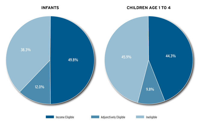 Statistics from a recently published Food and Nutrition Service report confirm that nearly half (49.8 percent) of all infants are born into families below 185 percent of the federal poverty guidelines—the cutoff for WIC income eligibility. (From July 2011 to June 2012, 185 percent of the poverty guidelines equaled $41,348 for a family of four.) Another 12.0 percent of infants are eligible because they participate in the Supplemental Nutrition Assistance Program (formerly Food Stamps), Medicaid, or Temporary Assistance for Needy Families. Among children age 1 to 4, a slightly smaller share, 44.3 percent, are eligible for WIC due to income and another 9.8 percent are eligible due to participation in another program.