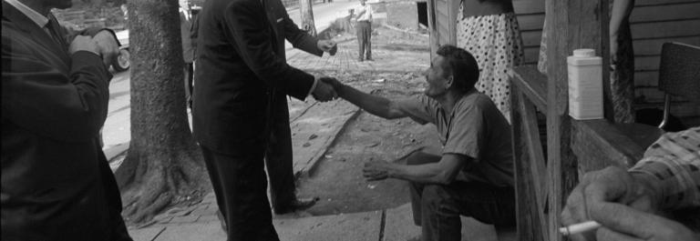 <p>President Lyndon B. Johnson shakes the hand of man during the Appalachia portion of his Poverty Tour on May 7, 1964. (Photo by Cecil Stoughton/LBJ Library)</p>