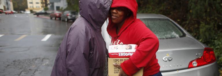 <p>Sandra Tramiel (l to r), public health nurse, Improving Pregnancy Outcomes Program, gives client Roseanda Hersey a kiss after presenting her with a package of diapers on her last full day of home visits on Tuesday, December 2, 2014 in Oakland, Calif. (Photo By Lea Suzuki/The San Francisco Chronicle via Getty Images)</p>