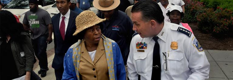 <p>Police Chief Peter Newsham chats with Joyce Robinson-Paul, a former Advisory Neighborhood Commissioner, as they walk around the neighborhood near Dunbar High School in Washington, DC on May 30, 2017. Community leaders, residents and the Chief of police walked the areas around the Truxton Circle and Bates neighborhoods to address the recent spate of shootings in the area. (Photo by Michael S. Williamson/The Washington Post via Getty Images)</p>