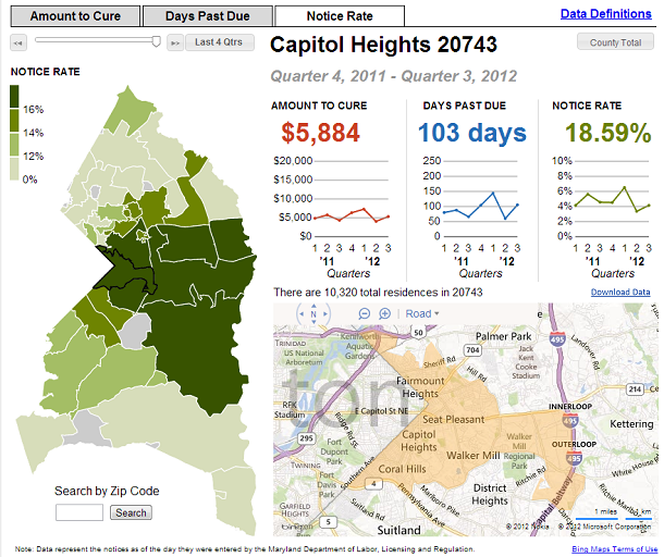In 2011, nearly 15 percent of all residences in Prince George’s—33,439 residences—received a notice of intent to foreclose (NOI) from their mortgage servicer. Of those, the median borrower was 79 days behind and owed $6,400 in loan payments, penalties, and fees. In some Prince George’s zip codes, one out of every four residences received an NOI.