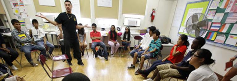 Hector Estrada, top center, who teaches social justice in a theater setting at the Refugee Youth Academy, addresses a group of immigrant students at the academy in the Brooklyn borough of New York. The Refugee Youth Academy is a six-week program run by the International Rescue Committee that tries to help refugee parents and children get familiar with what American school is all about. (AP Photo/Bebeto Matthews)