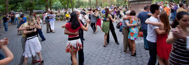 <p>Couples participate in free tango classes in Central Park by the 1872 Shakespeare statue at Literary Walk July 9, 2011 in New York City.</p>