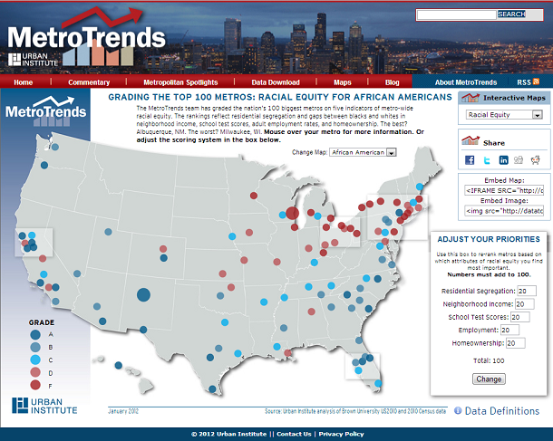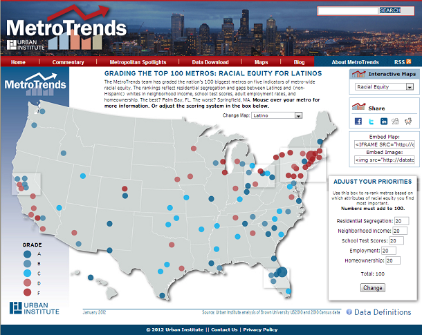 You can find any metro’s score (and all the underlying factors) on our map by mousing over and clicking on it. But you can also modify our scoring system. Maybe employment matters more to you than homeownership, or you don’t care about residential segregation at all. Change the relative importance of the five factors in the box, and MetroTrends will recompute the scores and display your new rankings.