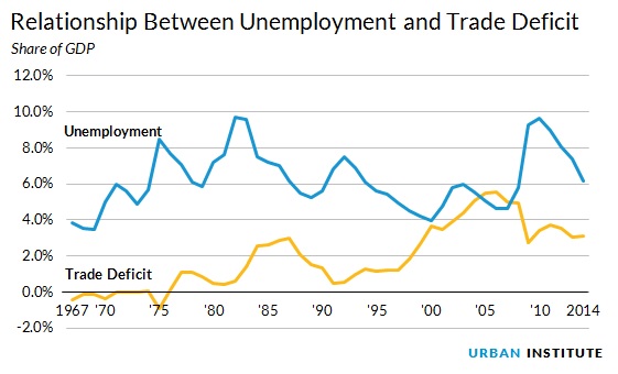 The common-sense view is that this 3 percent trade deficit leads to an equivalent share of the labor force not having jobs that they otherwise would have. Most economists, however, think the trade effect is minor. In particular, as the accompanying figure shows, they look at the unemployment rate and the deficit as a share of GDP and don’t see any correlation. For example, in both the 1980s and the 1990s, the trade deficit was rising and the unemployment rate was falling.