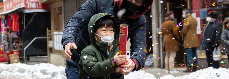 <p>A father helps his son set off a confetti cannon during Chinese New Year celebrations in Chinatown on February 12, 2021 in New York City. Lunar New Year, also known as the Chinese New Year, begins on February 12 and ushers in the Year of the Ox. Due to the ongoing coronavirus pandemic, this year's festivities and gatherings are being limited. (Photo by Alexi Rosenfeld / Getty Images)</p>