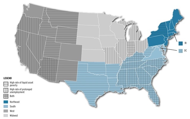 States With High Rates of Both Liquid Asset Poverty and Prolonged Unemployment Are Concentrated in the South