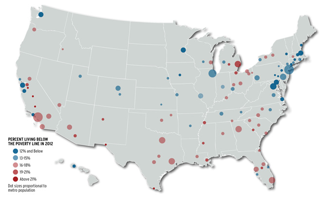 McAllen, Texas, experienced the highest poverty rate (38 percent) of any big metro area. Metro areas around Fresno, Bakersfield, and Modesto, California, and El Paso, Texas had poverty rates of about 25 percent, putting them among the worst. Metro areas with the highest poverty tended to be in medium-sized metro areas in the South and East North Central divisions, though larger metros in the West region also stand out on the map.