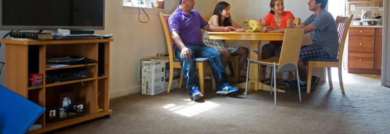<p>Family members visit around their dining table at the home they bought in the Riggs Park neighborhood of Washington D.C., Wednesday, July 28, 2015. Photo by Allison Shelley/For The Washington Post via Getty Images.</p>