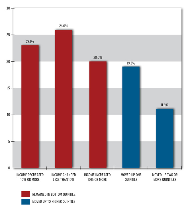 Based on this mid-decade experience, which low-income households enjoyed the greatest upward economic mobility? The educated, the married, the young, and non-Hispanic whites. The chances of advancing two or more quintiles within three years were appreciably higher for those with a bachelor’s degree: five times higher than for those who didn’t finish high school. Married people were twice as likely as the never married to jump two quintiles. And those 15 to 24 were twice as likely as those 45 to 64 to make the leap. Meanwhile, the odds for non-Hispanic whites were two-thirds higher than for blacks.