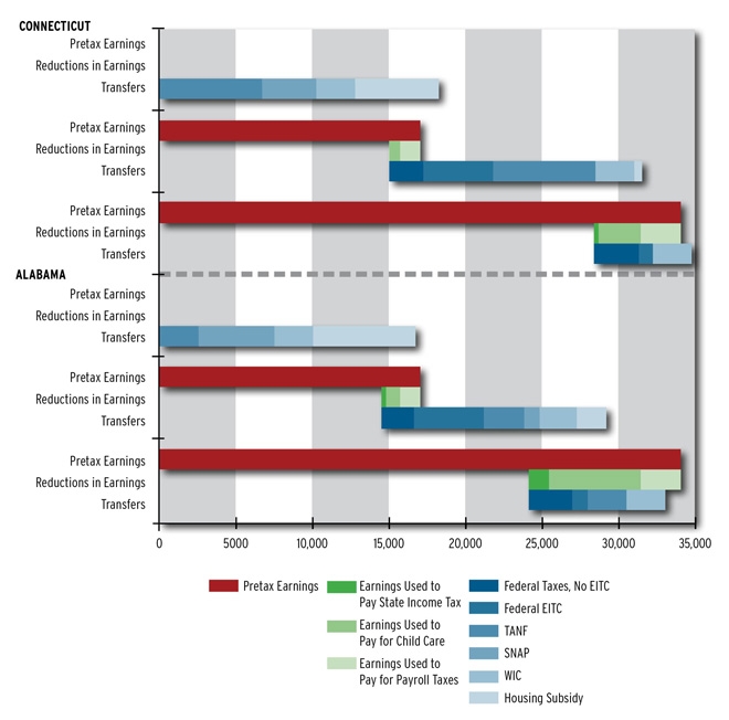 In addition, she could have received about $6,700 in federal tax credits and either owed state income taxes or received additional tax credits. For example, in Alabama her state tax bill would be over $300 while in Connecticut she would owe no states taxes. She would also have owed almost $1,300 in the employee side of payroll taxes. We assume her childcare costs, before subsidies, would increase to about $250 per month – some of which could be offset by childcare subsidies. Together, taxes and transfers could have changed this mom’s income from $17,000 in wages to between $27,500 and $32,000 in income and benefits, depending on where she lived.