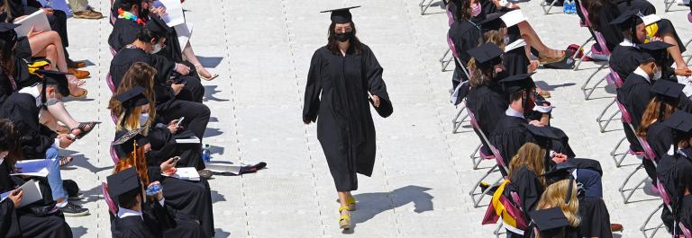 <p>Boston, MA - May 24: A graduate walks during the Boston College 144th commencement exercises in Alumni Stadium in Chestnut Hill, Boston, MA on May 24, 2021. (Photo by Pat Greenhouse/The Boston Globe via Getty Images)</p>