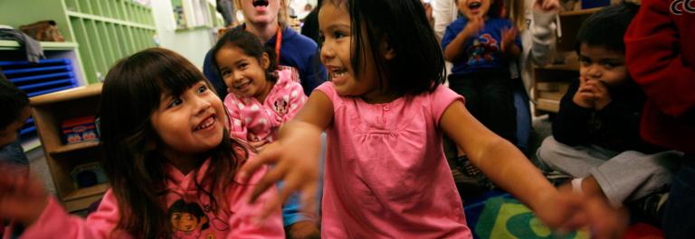 <p>Isabella Munoz and Alejandra Correa sing songs and dance during play hour at the St. Joseph Center early learning program on December 02, 2008. The center offers full-day, bilingual child care and pre-literacy activities for low-income children up to 5 years old. Photo by Barbara Davidson/Los Angeles Times via Getty Images</p>