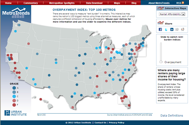 The housing wage shows the costs confronting low-wage workers looking to rent an apartment. The interactive map below ranks the 100 largest U.S. metros on the three measures of rent burden. Mouse over a metro to see more information; use the slider on the right to switch between measures.
