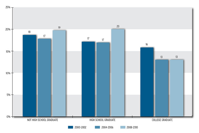 If you dig deeper, however, you find—as the figure here shows—that college grads aren’t retiring early. Their two-year retirement rate held steady between 2004 and 2008 while increasing 2 percentage points for high school drop outs and 3 points for high school grads. Partly that’s because college grads had enough savings to feel the stock market crash while most lower on the education ladder didn’t. Not only did they resist retirement when jobs became scarce, college grads were also less likely than those without BAs to lose their jobs during the recession.