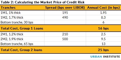 Adding up all three tranches, the market has priced the credit protection for the lower risk, Group 1 loans at about 16 bps. Adding in the 10 bps payroll tax supplement and 7 bps in costs and expenses brings the market’s estimated guarantee fee to around 33 bps.