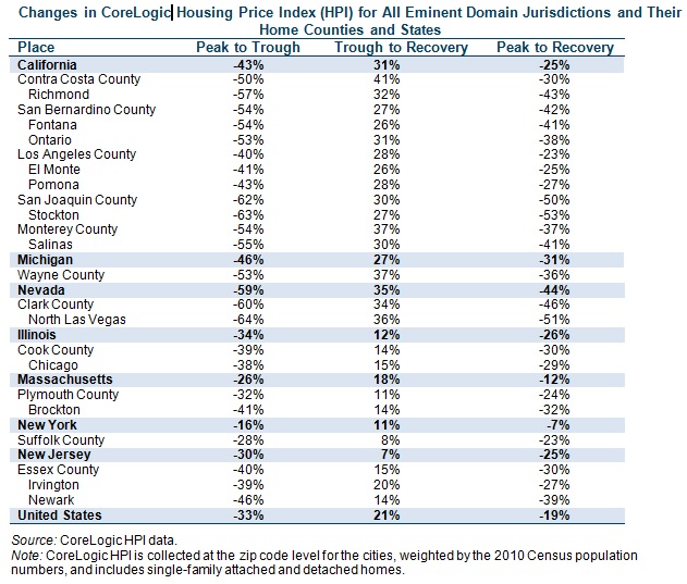 We tracked the changes in residential housing prices from peak to trough, trough to recovery, and peak to recovery. We used generally accepted time periods for the peak (2006) and trough (2011–12), and used the latest data (2013) for the recovery. We looked at all the cities that have considered the eminent domain plan and compared the changes in housing price indices (HPI) against the counties and states in which they reside. The data indicate that none of the municipalities have recovered as well as the nation overall. Based on housing price recovery from peak to recovery, none of the cities are improving as well their home states, and nearly all lag behind their counties.