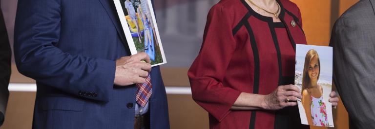 <p>During a June 13, 2018, press conference in the Capitol Visitor Center, Congressional representatives hold photos of people from their districts who have been affected by the opioid epidemic. (Photo by Sarah Silbiger/CQ Roll Call.) </p>