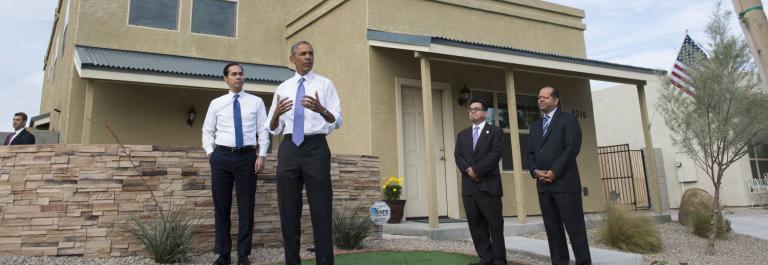 <p>US President Barack Obama speaks alongside Housing and Urban Development Secretary Julian Castro, left, during a neighborhood stop to highlight his administration's home purchase and refinancing policies in Phoenix, Arizona, January 8, 2015. Also alongside are Edmundo Hidalgo, right, CEO of Chicanos Por La Causa (CPLC) and David Adame, second from right, of CPLC. Photo by Saul Loeb/AFP/Getty Images.</p>