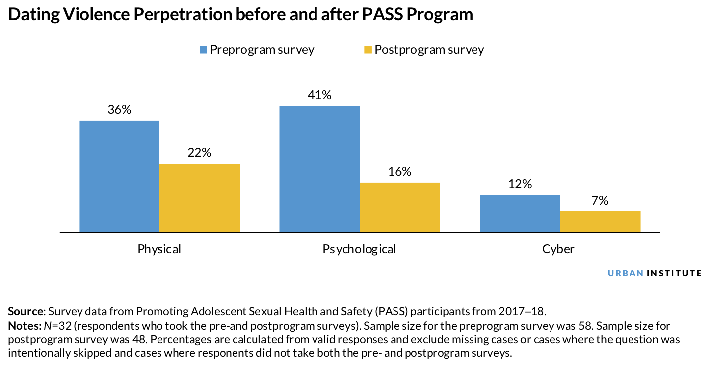 To measure the change in perception of abusive behaviors, the young people ranked 14 different types of abuse, from physically hurting someone to spreading sexual rumors, as not at all abusive, a little abusive, very abusive, or extremely abusive. Results indicate that young people who participated in the PASS program had greater awareness of what constitutes healthy and abusive dating relationships, with a greater number of young people ranking the types of abuse as at least “a little abusive” and up to “extremely abusive.” Dating violence, including physical, psychological, and cyber violence, decreased