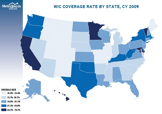 WIC coverage (the number of WIC participants divided by the number of WIC eligible) varies considerably by state. In 2009, state coverage ranged from 45.9 to 76.3 percent, compared with a national average of 60.9 percent. WIC coverage can vary for several reasons, including outreach, stigma, point of access (e.g., are new mothers encouraged to sign up while in the hospital), and ease of access (e.g., location of WIC offices, ease of redemption of benefits), to name a few. The five states with the lowest WIC coverage rates are Montana (45.9 percent), Utah (47.3), Colorado (48.5), Idaho (50.7), and Illinois (50.8). The five states with the highest WIC coverage rates are Vermont (76.3 percent), the District of Columbia (76.2), California (73.7), Minnesota (73.5), and Maryland (70.5). You can scroll over your state on the map below to see what WIC coverage was in 2009. In addition to each state’s WIC coverage rate, the map reports each state’s rank (highest = 1), the number of WIC-eligible and WIC-participating people, and a 90 percent confidence interval for the coverage rate estimate.