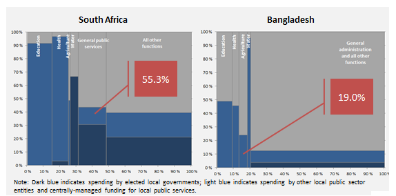 3. In order to be inclusive, the public sector has to be close to the people. One measure of inclusiveness is the efficiency of public expenditures—how much is spent on actual services people use. However, the public sector is “closer to the people” in some countries than other countries. For instance, in South Africa over half of public-sector spending takes place below the national level (the blue shaded areas in the graph below). This includes spending by provincial and local governments, as well as national government spending on services that are delivered locally. In contrast, in Bangladesh less than a fifth of public resources reach the front line for service delivery. Indeed, initial evidence suggests that the “vertical allocation” of public-sector resources varies considerably across countries. As such, an important target for the post-2015 development agenda should be to increase the share of resources used for frontline services, and to ensure that public resources are governed and managed close to the people.