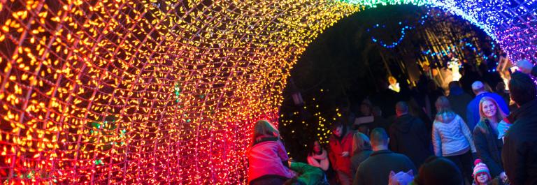 <p>Visitors pass under a rainbow-colored tunnel of holiday lights during the PNC Festival of Lights preview night at the Cincinnati Zoo and Botanical Garden, Friday, Nov. 20, 2015, in Cincinnati. (AP Photo/John Minchillo)</p>