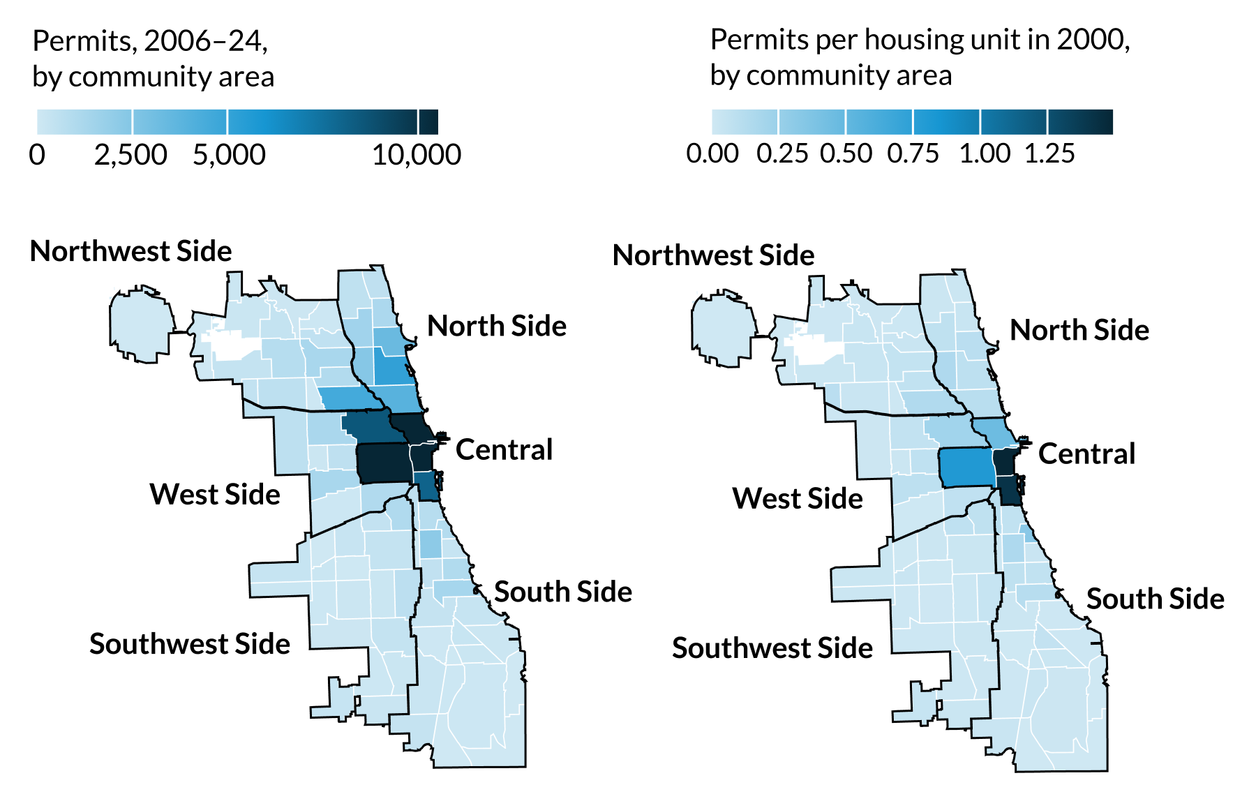 Sources: Author’s calculations, based on an analysis of City of Chicago open data (2006–24), the 2000 US Census, and US Census Bureau’s American Community Survey five-year data (2018–22).